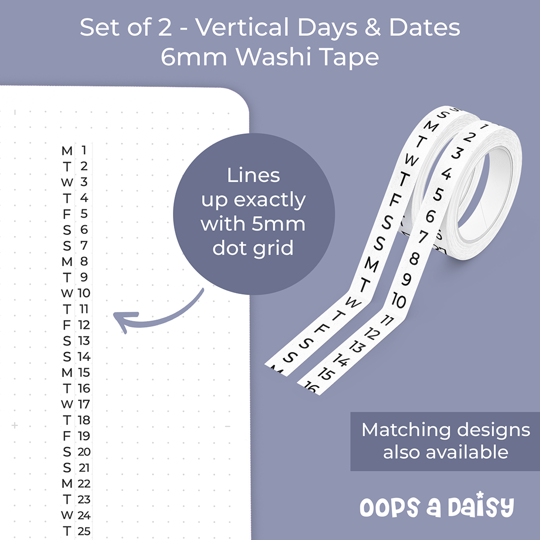 A pack of two tapes, the first features the days of the week and the second features dates 1-31. Both are perfectly spaced to fit vertically on a 5mm dot grid journal page. Perfect for monthly journal spreads, or tracker layouts!