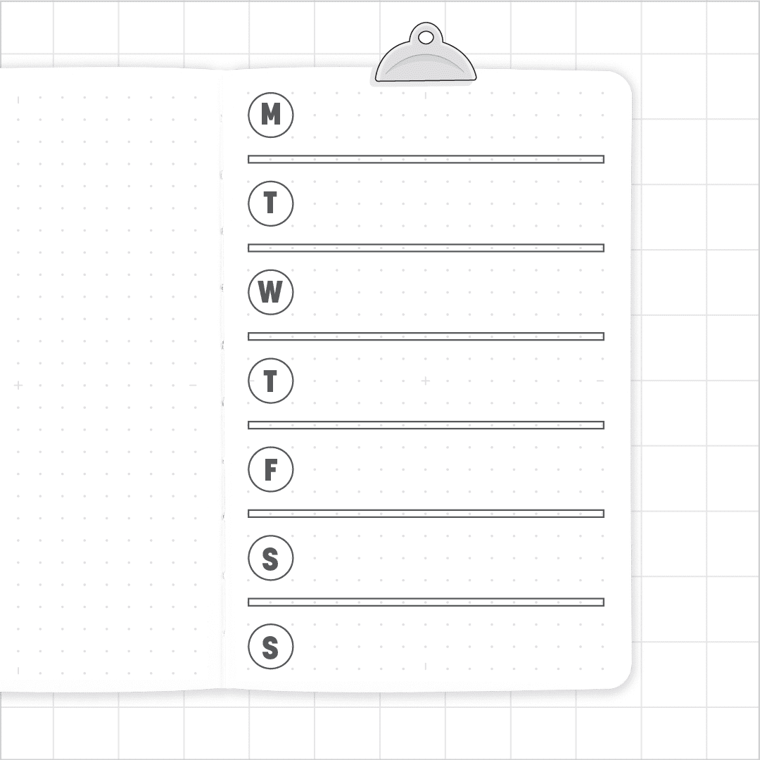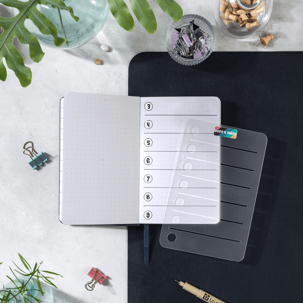 This journal stencil helps you create a versatile single page weekly journal spread. Simply trace all the elements onto your page, and use the circles as place holders for the days or dates. Perfect for a pocket sized weekly agenda or meal planner!