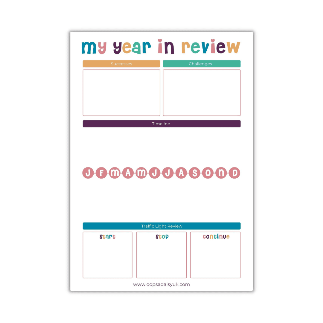 Our Year End Review Page is downloadable as a high quality PDF for you to print at home. Designed to help you to reflect on the previous year, you can write down your successes and challenges, then focus on what you would like to start, stop and continue in the year ahead.